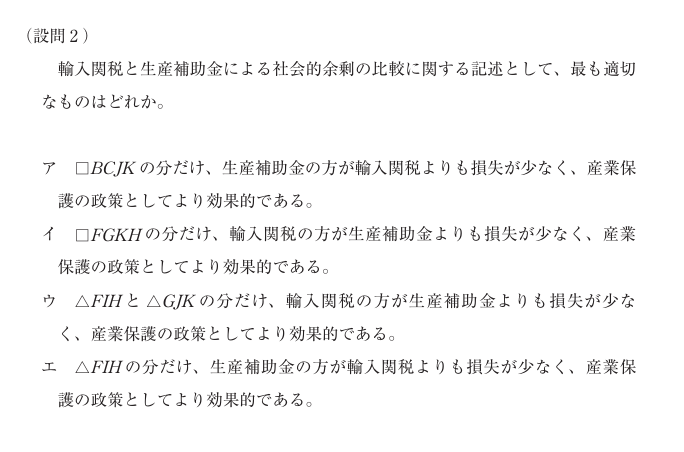 • よって、国内産業の保護という点では、生産補助金の方が社会的損失が少なく、効率的である。