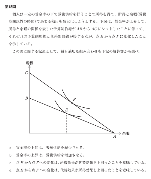 この時点で、選択肢a「労働供給を減少させる」が正しく、bは間違いだと分かります。