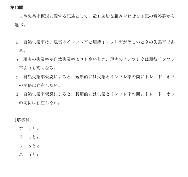 Geminiの解説と物語で、「自然失業率仮説」はもうバッチリですよね!では、冒頭の過去問をもう一度見てみましょう。知識が定着した今なら、自信を持って正解が選べるはずです。