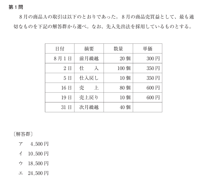 「8月の商品売買益として、最も適切なものはどれか。なお、先入先出法を採用している」という問題です。