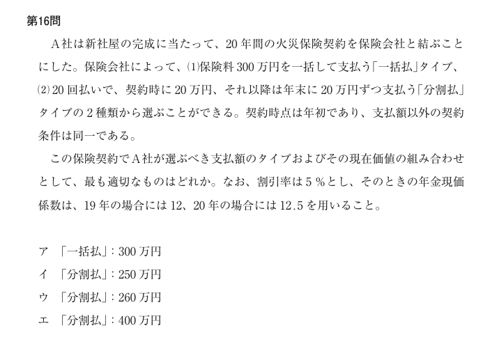 分割払いの場合、1年後の20万円、2年後の20万円……と、19回分の割引計算をする必要があります。これをまともにやると試験時間が終わります。
