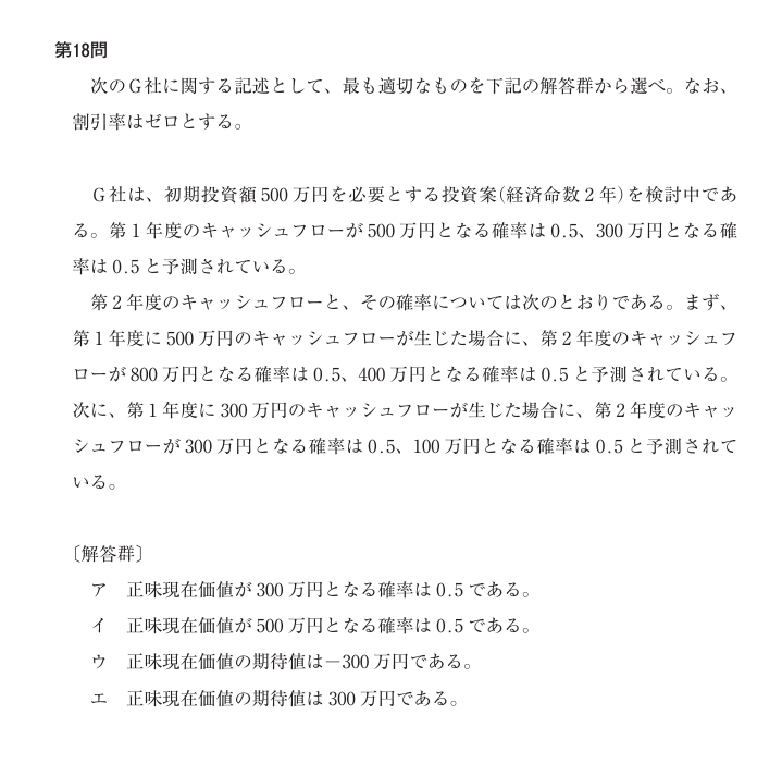 この計算結果から、正解は選択肢4「正味現在価値の期待値は300万円である。」となります。