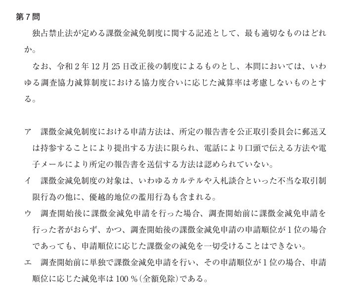イ: 課徴金減免制度の対象は、カルテルや入札談合の他に、優越的地位の濫用行為も含まれる。