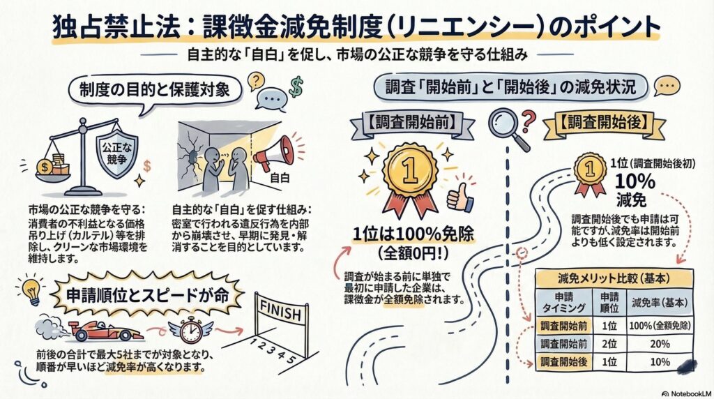 ご覧の通り、リニエンシーは「申請順位とスピードが命」です。調査開始前の1位ならなんと100%免除(全額0円!)。この強烈なアメを用意して、共謀している企業を裏切らせるのが目的です。